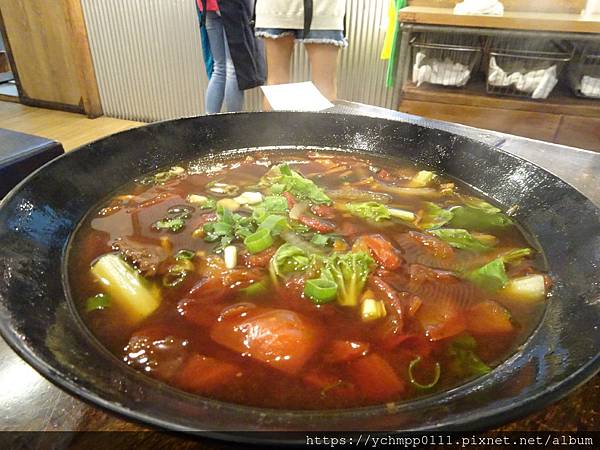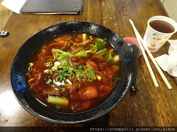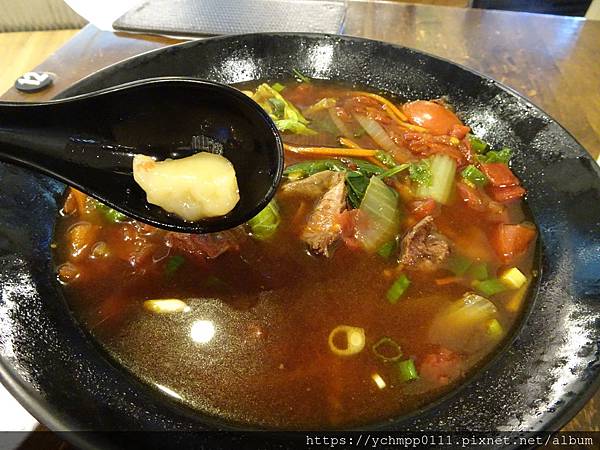 內含小白菜、洋蔥、番茄、牛肉、麵疙瘩,還撒了一些蔥花
