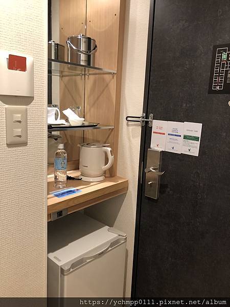 門的右手邊是冰箱、熱水壺、茶包和茶具等