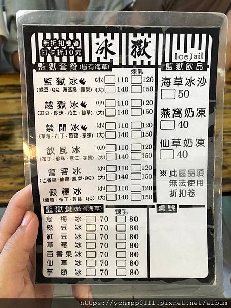 監獄系列皆有海草,額外加煉乳$10,含葡萄、布丁、蒟蒻、QQ。